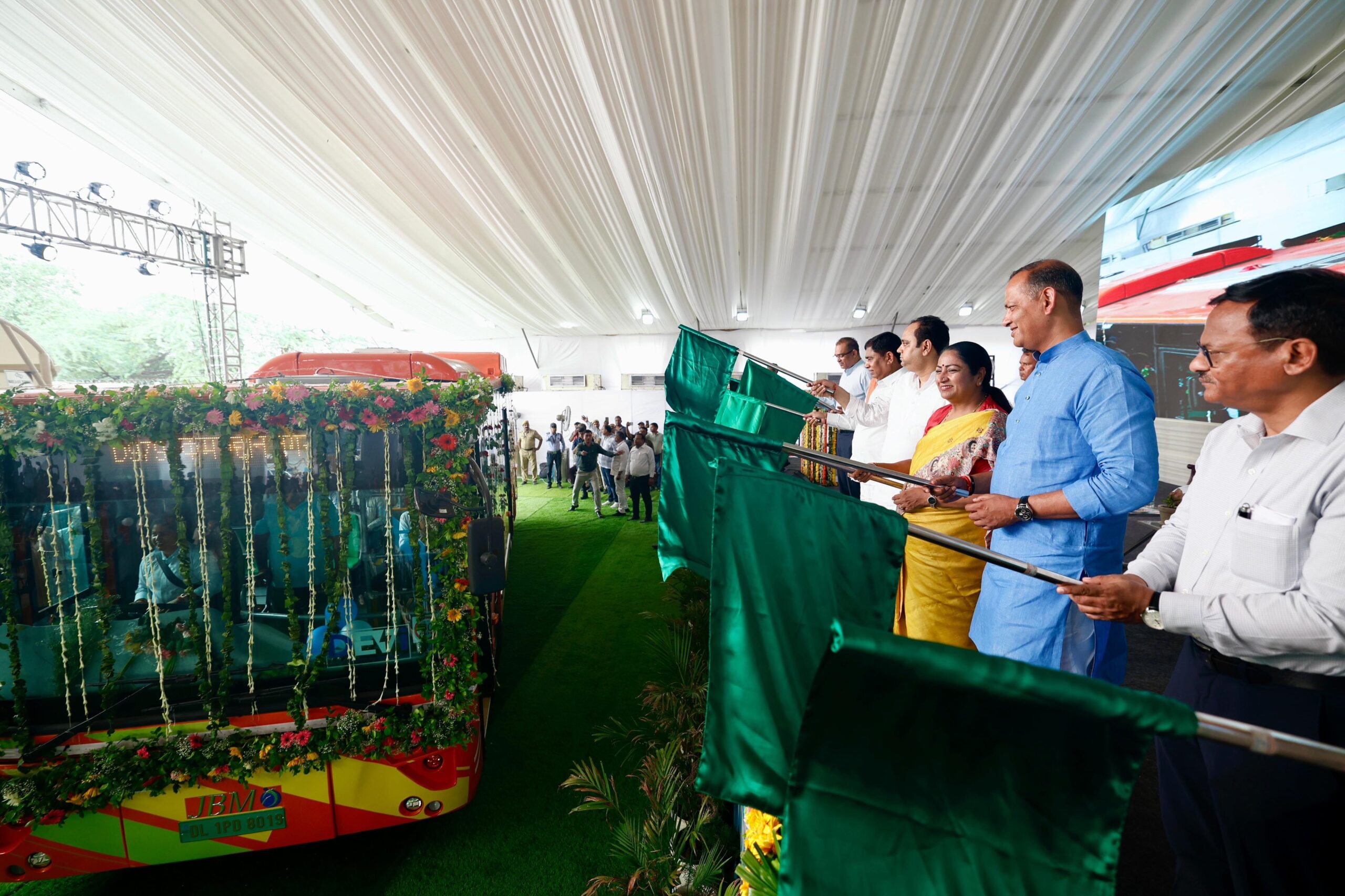 को हरी झंडी दिखाकर रवाना किया। ये बसें “दिल्ली इलेक्ट्रिक व्हीकल इंटरचेंज (देवी)” योजना के