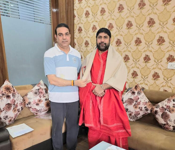 ढांड, 19 सितंबर : भाजपा के वरिष्ठ नेता अशोक गुर्जर ने आज ढांड स्थित अपने निवास पर बाबा राजपुरी डेरा के महंत नरेश पुरी जी महाराज का भव्य स्वागत-सत्कार किया। इस अवसर पर अशोक गुर्जर ने महंत जी को सम्मान स्वरूप शॉल ओढ़ाकर सम्मान किया और परिवार सहित उनका आशीर्वाद प्राप्त किया। इस अवसर पर अशोक गुर्जर ने कहा कि संत-