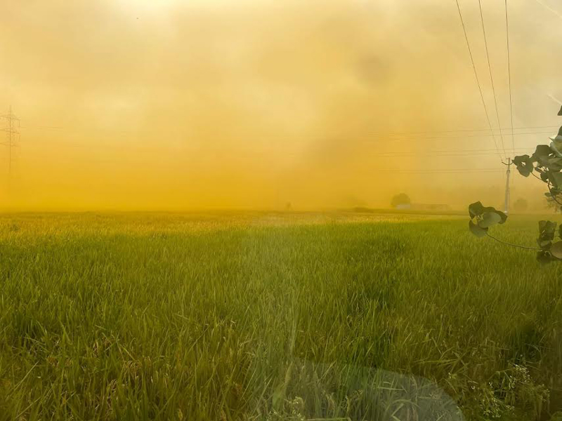 तरफ आज अचानक चली तेज आंधी ने पूरे आसमान को पीला कर दिया। यह नजारा देख लोग चौंक गए। लेकिन असल वजह किसानों के लिए गहरी चिंता का कारण बनी हुई है। खेतों में खड़ी धान की फसल में फालस समट (कंडुआ) बीमारी फैल गई है, जिसने देखते ही देखते पूरी फसल को नुकसान पहुंचा दिया है। पीडि़त किसानों ने प्रदेश सरकार से जल्द से जल्द उचित मुआवजा देने की मांग की है। खेतों में खड़ी धान की फसल कंडुआ रोग की चपेट में आने से पीली दिखाई देते हुए।