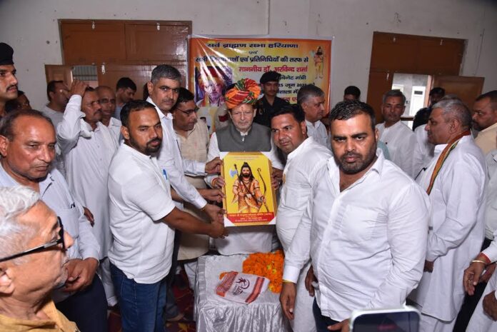 बुधवार दोपहर ब्राह्मण धर्मशाला में सर्व ब्राह्मण सभा हरियाणा के तत्वावधान में प्रदेश के सभी जिलों के ब्राह्मण संगठनों के जिलाध्यक्षों व प्रतिनिधियों द्वारा सुरेंद्र शर्मा बडौता व विजय शर्मा विक्की की अगुवाई में सहकारिता मंत्री डॉ अरविंद शर्मा का जोरदार अभिनंदन एवं स्वागत करते हुए फरसा भेंट किया गया। मंत्री ने ब्राह्मण धर्मशाला में विकास कार्य के लिए 11 लाख