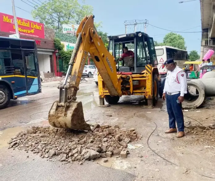 पर बने गड्ढों की हालत को देखकर तत्परता से कार्य करते हुए यातायात निरीक्षक नीरज व यातायात