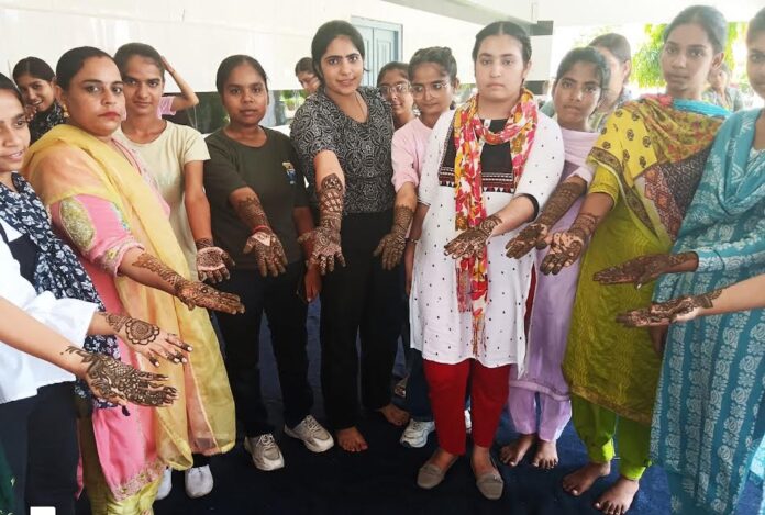 कैथल । इंदिरा गांधी पीजी महिला महाविद्यालय के गृह विज्ञान विभाग द्वारा तीज उत्सव के उपलक्ष्य में मेहंदी प्रतियोगिता का आयोजन किया गया। छात्राओं ने अपने व अपनी सखियों के हाथों पर सुंदर और कलात्मक डिजाइनों की मेहंदी रचाई व प्रतियोगिता में प्रतिभागियों ने रचनात्मकता और सांस्कृतिक अभिव्यक्ति का शानदार प्रदर्शन किया। पारंपरिक, आधुनिक तथा नवाचारी थीम पर आधारित मेहंदी डिजाइनों ने सभी का ध्यान आकर्षित किया। छात्राओं की कलात्मक प्रतिभा की सराहना करते हुए कॉलेज प्राचार्या डॉ आरती गर्ग व सांयकालीन प्राचार्या