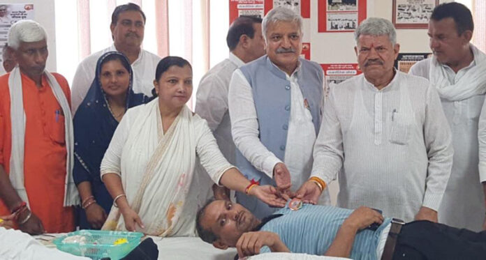 कहा कि रक्तदान एक महादान है और सेवा पखवाड़ा का मूल उद्देश्य समाज के हर वर्ग तक सेवा की भावना को पहुंचाना है। उन्होंने कहा कि प्रधानमंत्री नरेंद्र मोदी का जन्मदिवस सेवा कार्यों को समर्पित कर मनाना हर कार्यकर्ता का कर्तव्य है। जिला प्रभारी अमरपाल राणा ने कहा कि सेवा पखवाड़ा प्रधानमंत्री के जन्मदिवस के अवसर पर समाजसेवा का एक