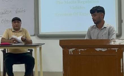 कैथल । आरकेएसडी कालेज के अंग्रेजी विभाग द्वारा मीडिया नियमन अभिव्यक्ति की स्वतंत्रता का उल्लंघन विषय पर एक वाद विवाद प्रतियोगिता का आयोजन किया गया। यह कार्यक्रम भाषा प्रयोगशाला में बीए पांचवें सेमेस्टर के व्यावसायिक पाठ्यक्रम अंग्रेज़ी फॉर मीडिया एंड जर्नलिज़्म के विद्यार्थियों के लिए आयोजित किया गया। कार्यक्रम का