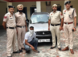 पास नाकाबंदी की। थोड़ी देर बाद जैसे ही एक आल्टो कार मौके पर आई, पुलिस ने उसे रुकने का इशारा किया तो चालक गाड़ी मोड़कर भागने लगा, लेकिन पुलिस ने तुरंत घेराबंदी कर आरोपी को काबू कर लिया। आरोपी उस समय हरियाणा पुलिस की लोगो लगी टी-शर्ट पहने हुए था। पूछताछ में आरोपी की पहचान विजय कुमार निवासी थेह बनेहड़ा के