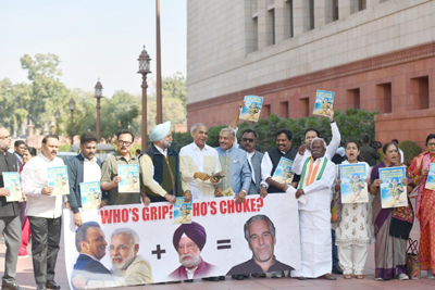 प्रदर्शन में किशोरी लाल शर्मा, प्रमोद तिवारी और कार्ती चिदंबरम समेत कई विपक्षी सांसद शामिल रहे।
