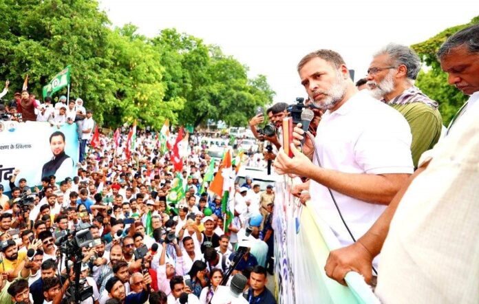 मैंने उनसे पूछा कि आपको क्या लगा? और सभी ने कहा कि चुनाव आयुक्त भाजपा जैसे बात कर रहे हैं। वो भूल रहे हैं कि वो किसी राजनीतिक पार्टी के नहीं हैं, वो हिन्दुस्तान के इलेक्शन कमिश्नर हैं और उनका काम संविधान की रक्षा करना है। इससे पहले राहुल गांधी पटना स्थित आयकर गोलंबर पर पहुंचे, जहां पहले से ही बिहार विधानसभा के नेता प्रतिपक्ष तेजस्वी यादव मौजूद थे। यहां महागठबंधन के कार्यकर्ताओं का हुजूम उमड़ा हुआ था। इसके बाद तजस्वी यादव, राहुल गांधी, दीपांकर भट्टाचार्य और मुकेश सहनी जैसे महागठबंधन के दिग्गज नेता वाहन पर सवार होकर मार्च के लिए निकले।